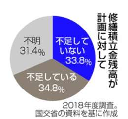 国交省の2018年度調査によると、計画に対して積立残高が「不足している」「不明」と回答した管理組合は全体の約3分の2に上る。マンションの老朽化により、資金不足で適切に修繕できなくなる懸念が高まると指摘されている。