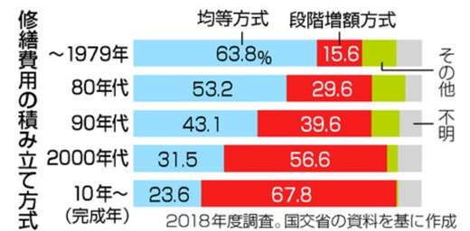 積立金を巡り、国交省は安定的な積み立てが可能な均等方式を推奨。ただ、初期の負担が少なくて済む段階増額方式を採る新築マンションは増え続け、10年代以降は7割近くに達している。計画の初年度と比べ最終年度の金額が10倍超に膨らむケースもあり、滞納が生じたり、所有者間で合意できずに予定した値上げが実現できなかったりするトラブルも起きている。