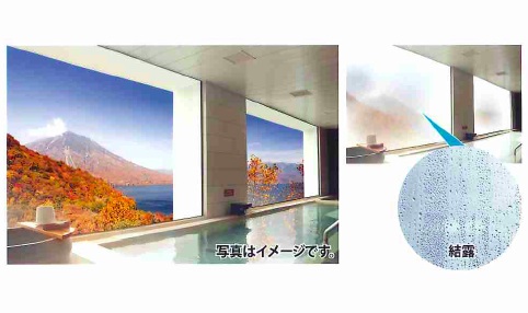 製造過程でガラスに透明導電膜を蒸着。通電すると透明感を維持したままガラスが暖かくなるため、コールドドラフトを防止し、快適な窓辺をつくりだすことができる。住宅や温泉旅館の浴室など、窓から見える景色を楽しみたいという場所に適する。