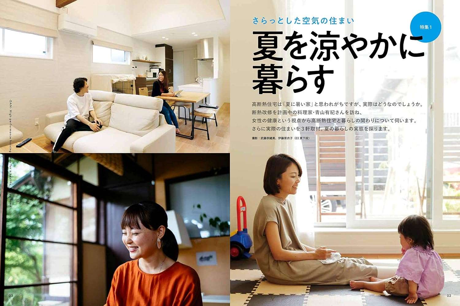 今号の特集1では「夏を涼やかに暮らす」をテーマに高断熱住宅の夏の暮らしの実態を探ります。 断熱改修を計画中の料理家・青山有紀さんを訪ね女性の健康という視点から高断熱住宅と暮らしの関わりについて伺うとともに実際の住まい・住まい方を紹介します。