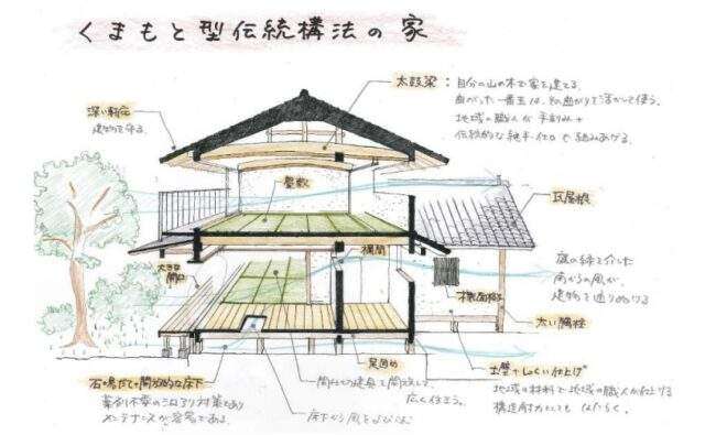 ▽くまもと型伝統構法の家(すまい塾古川設計室)=地方都市の中心市街地にある敷地において、緑化による建物周囲の環境配慮、施主所有の山の木の積極的活用を図りつつ、行政が産学官連携により独自に作成した設計指針を用いて設計した地域型伝統構法の住宅。