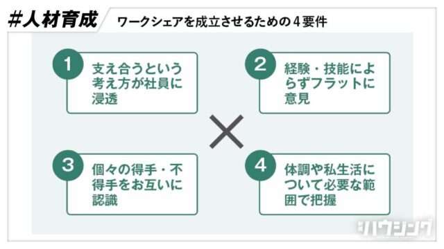 同社では、通常1人で担当する業務を2人で担当し、担当外のスタッフも適宜サポートする仕組みが出来上がっている。こうしたワークシェアを成立させるには、主に4つの条件がある。1つ目がお互いを支え合うという考え方が社員に浸透していること。2つ目が経験年数や習得技能などによらずフラットに意見できること。3つ目は・・・