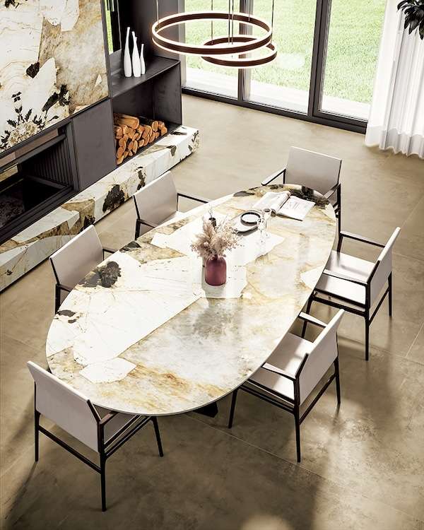 「GARZAS(ガルザス)」は、天然石の美しさと大胆な模様を表現した大判セラミックタイルコレクション。