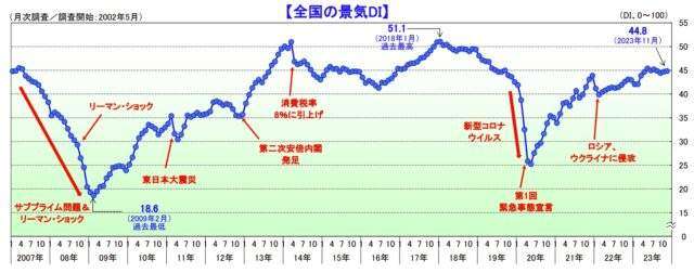帝国データバンク(TDB、東京都新宿区)は12月5日、2023年11月の景気動向調査結果を公表した。景気DIは前月比0.1ポイント増の44.8となり、2カ月連続で改善した。国内景気は、個人消費関連が低調だったものの、インバウンド需要や活発な公共工事の下支えで小幅ながら改善が続く。今後の見通しは、「国内景気は、賃金動向に注視しつつも、設備投資やインバウンド需要の拡大」で、横ばいで推移するとみられるとした。
