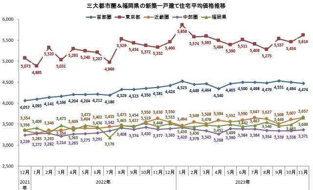 東京カンテイ(東京都品川区)は12月7日、主要都市における11月の新築一戸建て(土地面積100㎡以上300㎡以下)の供給動向を発表した。平均価格は、東京都は上昇に転じたが、神奈川県と埼玉県が反転下落し、首都圏全体では下落が続いた。一方、分譲戸数は全都県で2ケタ増加となった。