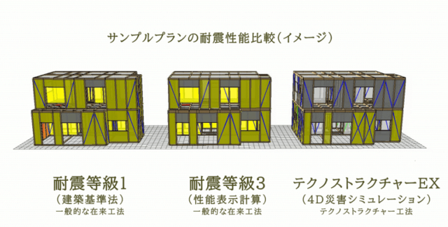 「テクノストラクチャーEX」では、繰り返す巨大地震への強さを実現するために、独自に生成した人工地震波を用いた「4D災害シミュレーション」を実施。「テクノストラクチャー」の構造躯体に地震の力を吸収する制震ダンパーを、シミュレーションを元に算出した適切な量と配置で加えることで建物への影響を最小限に抑制し、繰り返す巨大地震への強さを実現した。延床面積500平方メートル以下まで設計対応可能とする。