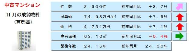 首都圏の中古マンションの成約件数は2900件(同3.7%増)で6カ月連続で前年同月を上回った。成約㎡単価は74.98万円(同7.6%増)で43カ月連続で前年同月を上回った。成約価格は4731万円(同7.1%増)で42カ月連続で前年同月を上回った。専有面積は63.10㎡(同0.4%減)だった。