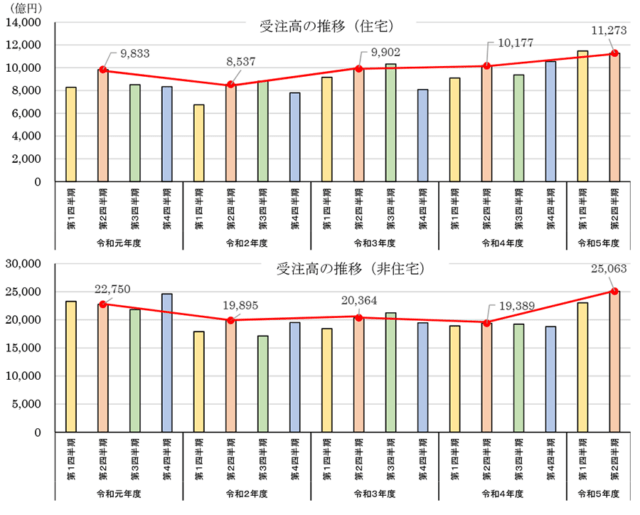 用途・構造別では、木造の「一戸建住宅」が5372億円(同8.7%増)、コンクリート系構造の「共同住宅」が4657億円(同15.6%増)、「一戸建住宅」が284億円(同37.0%増)。発注者別では、「個人」7275億円(同8.2%増)、「管理組合」2021億円(同20.4%増)、「民間企業など」1223億円(同18.9%増)などとなった。