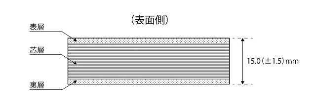 木材の難燃処理を行う場合、一般的には難燃剤(液剤)を木材へ含浸することで不燃化するが、木材全体で均一な不燃性能をもつことは難しく、使用する難燃剤によっては経年変化で白華を起こすことも課題となっていた。そこで両者は、粉状のほう酸をチップに混入・プレスすることで薬剤を均一に分布させた「不燃パーティクルボード」(ほう酸混入木質チップ板)を開発。安定した不燃性能を発揮するほか、潮解性の低いほう酸を使用することで白華現象が発生する可能性を限りなく低くした。厚さは15.0(±1.5 )mm。
