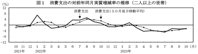 総務省が12月8日に公表した2023年の「家計調査報告」(10月分)によると1世帯(2人以上)あたりの消費支出は30万1974円。物価水準の変動の影響を除去した実質で前年同月比2.5%減少、8カ月連続でマイナスとなった。名目では同1.3%の増加。物価の上昇により出費を抑える傾向が続いている。