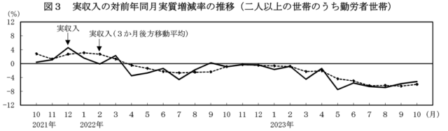 勤労者世帯1世帯当たりの実収入は55万9898円で、実質で同5.2%、名目で同1.5%の減少となった。