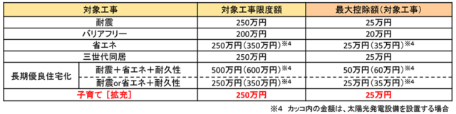 既存住宅のリフォームに係る特例措置の拡充および2年延長(2026年12月31日)も行われる。2024年12月31日までに子育て世帯が子育てに対応した住宅へのリフォームを行う場合に、標準的な工事費用相当額の10%を所得税から控除する。対象は、①住宅内の事故を防止するための工事(手すり設置など)、②対面式キッチンへの交換工事、③開口部の防犯性を高める工事、④収納設備を増設する工事、⑤開口部・界壁・床の防音性を高める工事、⑥間取り変更工事。対象工事限度額は250万円、最大控除額は25万円。