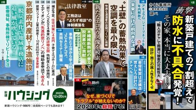 8面の連載「一寸先は闇!トラブル防げ!工務店ケーススタディ」では、本連載で取り上げた2023年のクレーム、トラブルを総括。今年もいろいろあった・・・。働き方改革、インボイス制度、電子契約など、業務内容の変化を迫られる状況であるだけに、「思わぬところに落とし穴」があった1年だったのではないでしょうか。