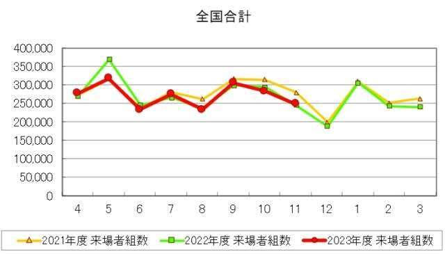 エリア別では、東海、近畿、中国・四国、九州・沖縄の4エリアが増加。近畿(17.6%増)は6カ月連続で増加し、中国・四国(12.3%増)も大きく持ち直した。東海(1.5%増)、九州・沖縄(2.3%増)も増加へ転じた。一方で、北海道、東北、関東、信越・北陸の4エリアは減少に。好調だった信越・北陸(11.3%減)が8カ月ぶりの減少へと転じ、北海道(17.4%減)、東北(13.5%減)、関東(2.5%減)も減少が続いた。今期来場者の累計は216万7713組で、前年比2.7%減となった。
