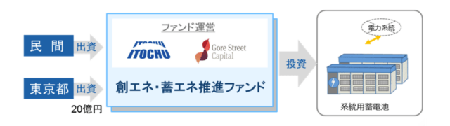 伊藤忠商事(東京都港区)はこのほど、東京都が進める創エネ・蓄エネ推進ファンドの運営事業者にGore Street Capital Limited(GSC、ロンドン)と共同で選定された。GSCと法人を設立の上、東京都が出資参画する官民連携の系統用蓄電池専業ファンドを運営する。