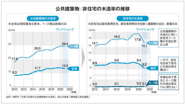 2009年の「公共建築物等木材利用促進法」の制定以降上昇を続けた公共建築物・非住宅の木造率だが、ウッドショックで下降。現状は公共建築の1-3階建てで29.4%、全体では13.2%。非住宅においては1-3階建てが15.1%、全体が8.2%に留まっている[図]。