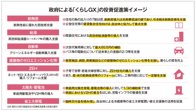 脱炭素・エネルギー安定供給・経済成長の3つが重なる分野には政府からの資金投入と投資促進策が講じられる。その一丁目一番地に位置づけられているのが「くらしGX」だ。