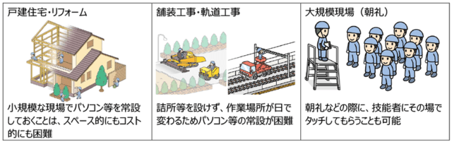 スペースが限られる戸建住宅・リフォームなどの現場や、作業場が日々変わるために詰所を設置できない配管・舗装工事などの現場、通信回線が届かない山奥の現場、離れた複数の箇所で朝礼が行われる大規模な現場、現場管理者が複数の小口現場を巡回する場合などにも活用できる。