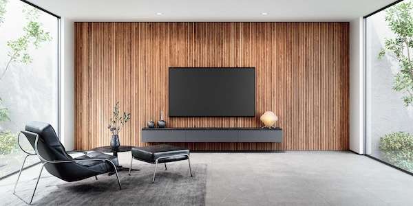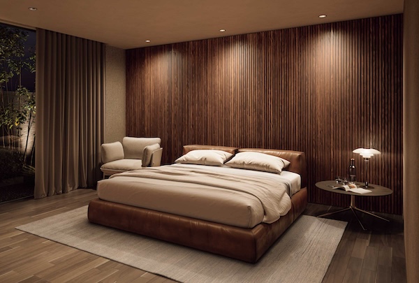 化粧壁材は壁面全体に配置することで洗練された空間をつくり上げる。天井高さ2400・2500・2700mm、幅292・162mm。
