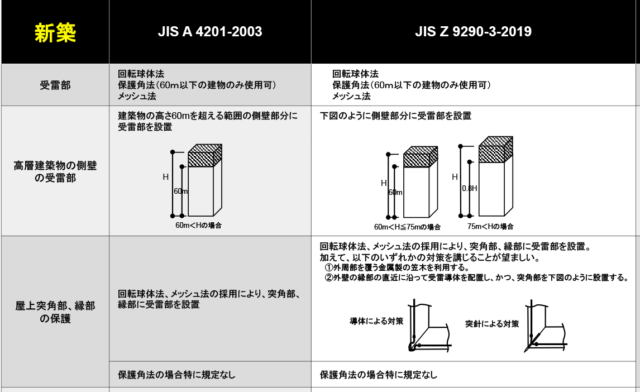 そこで、屋上突角部への保護方法などを規定した「JIS Z9290-3-2019」(雷保護-第3部:建築物等への物的損傷及び人命の危険)が制定されたことに伴って、避雷設備について定めた告示の内容の見直しを実施。「JIS A4201-2003」「同-1992」に適合する構造方法を廃止し、「JIS Z9290-3-2019」に適合する構造方法を採用することとなった。