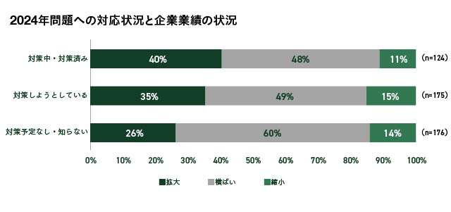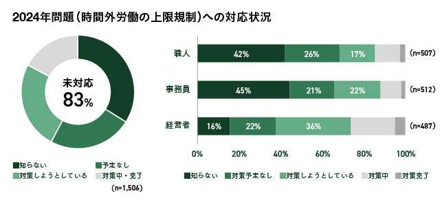 『建設業の2024年問題に関する動向調査(クラフトバンク社、2023年9月)』によれば、2024年4月からの時間外労働の上限規制厳格化に対し、工事会社の83%が未対応という結果が示されている。