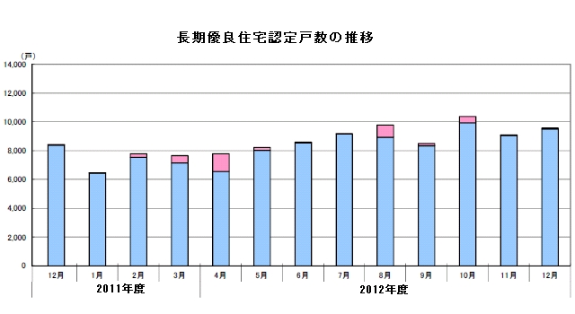 国土交通省が1月17日発表した2012年12月の長期優良住宅認定戸数は、戸建て住宅が9517戸、共同住宅などが75戸で、合計9592戸だった。4カ月連続で前年同月を上回った。