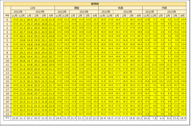 LDKであれば、8時から23時の在室時間では平均20.91℃、寝室は就寝時間の朝7時までは23.2℃とかなり高くなっています。