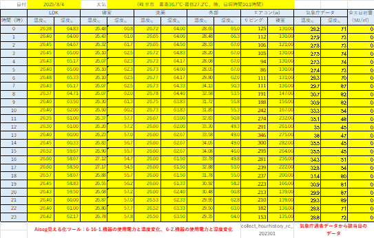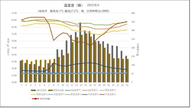 8月4日は外気温が28℃から35℃とかなり暑く、LDKと寝室ともに冷房を連続運転しているようです(来年は在室時運転での違いを依頼)。LDKでは平均26.4℃、寝室は26.5℃、洗面所は26.6℃で、一日中かなり涼しく快適に過ごされているようですが、150W前後の消費エネルギーで過ごされています。
