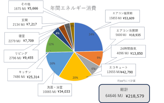 合計の消費エネルギーは69,390MJのシミュレーションに対して64,646MJとなっています。延べ床面積が165㎡ですので、391.8MJ/㎡となっており、私が目指す500MJ/㎡の目標を上回っています。