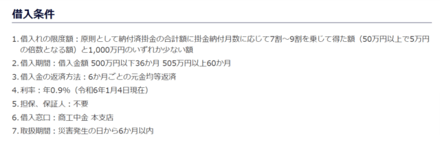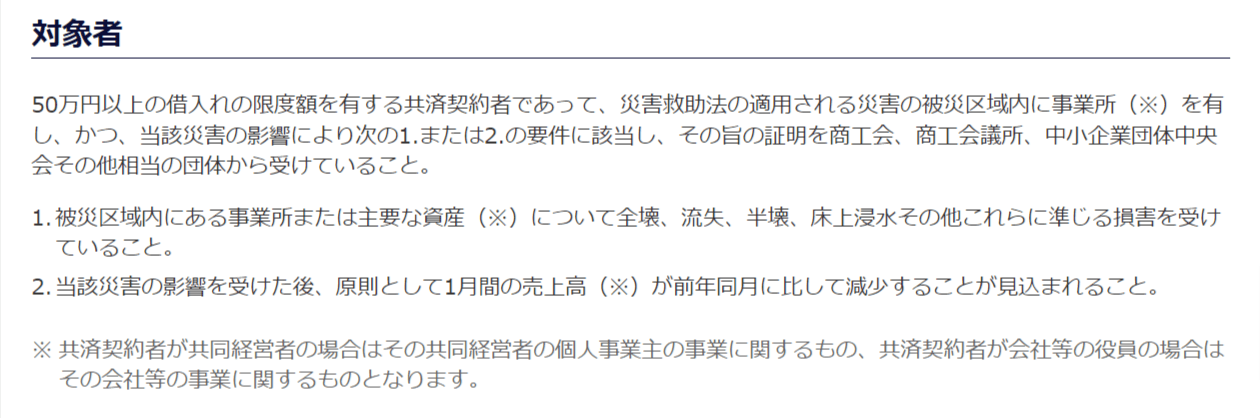 中小機構は、能登半島地震で被災した災害救助法の適用地域の事業者かつ共済契約者を対象に、原則として即日かつ低利で借入可能な災害時貸し付けを実施中だ。具体的な対象や借入条件は以下の通り。