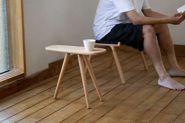 サイドテーブルはかわいらしい3本脚が特徴。天板と脚はねじ込んでつなぎ、工具を使わずに組み立て・分解ができる。