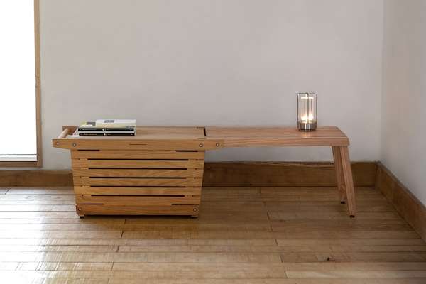 ウィングテーブルは、フラップ式の脚を開き、天板の端をコンテナ本体のハンドルに引っ掛けてスペースを拡張することができる。脚は天板裏に収納して持ち運べる。