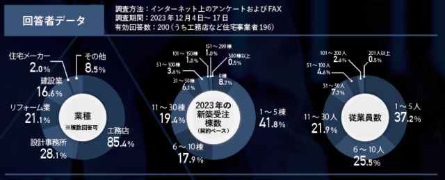 新建ハウジングでは2023年12月、工務店・住宅関連事業者に対する「業況アンケート」を実施した。住宅業界の難局を、工務店はどう乗り込えようとしているのか、今後の市場をどう見通しているのか、アンケートの結果から見てみよう。今号で掲載できなかった結果も、次号以降随時掲載する。
