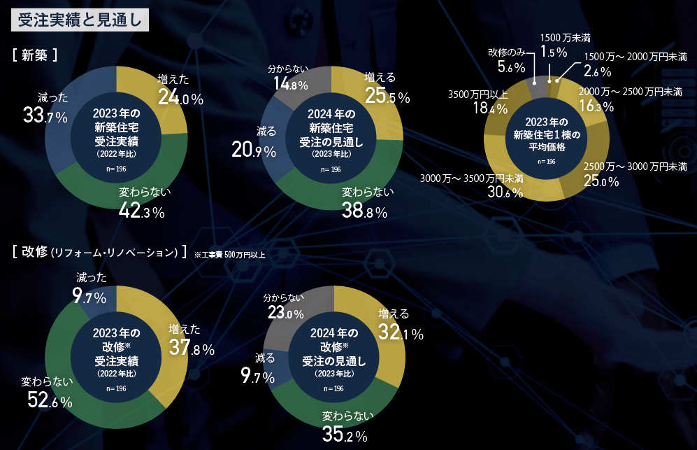 2023年の新築受注実績は「減った」が前年から3.3ポイント増の33.7%に。前年と同等以上の受注を維持できた事業者は減り、好調な事業者と苦しい事業者の差が明確になりつつあるようだ。単価のボリュームゾーンも3000万円台にシフトしている。リフォーム・リノベーションの受注は「増えた」が37.8%(同7.4ポイント増)と好調。24年は、市場・需要の縮小を見通す意見が多勢を占める状況は昨年と変わらないが・・・