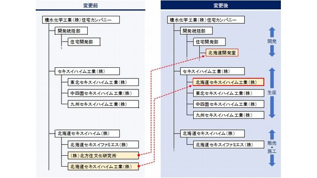 北海道向け住宅の生産部門である北海道セキスイハイム工業株式会社(北海道岩見沢市)を、セキスイハイム工業株式会社(埼玉県蓮田市)の100%出資子会社とした。また、北海道向け住宅の開発部門である株式会社北方住文化研究所(北海道札幌市)の機能を、同社住宅カンパニー開発統括部に移管し「北海道開発室」を新設した。