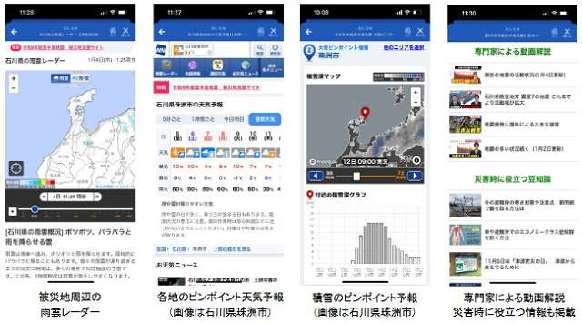 「被災地支援サイト」では、被害リポートマップのほかにも、被災地周辺の60時間先までの雨雲レーダーや10日先までのピンポイント天気予報、積雪や雨量の予想など、最新の気象・防災情報などを発信。専門家による動画解説や各自治体情報もすべて無料で確認でき、二次災害防止や避難生活における健康管理などに役立ててほしいとしている。