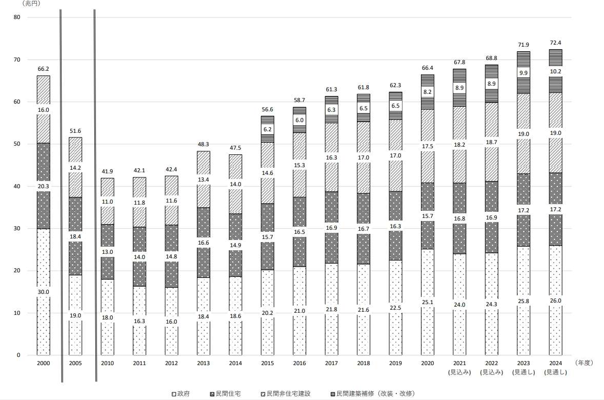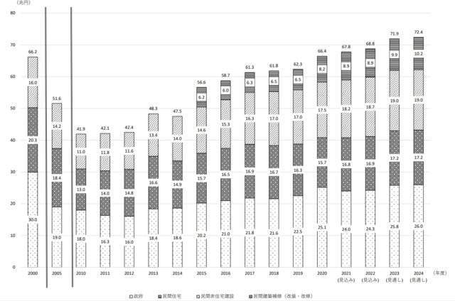 民間の非住宅(建築・土木)投資は、23年度19兆円、24年度19兆100億円と予測する。また建築補修(改装・改修)投資は、全体で23年度12兆1500億円(同12.1%増)、24年度12兆4700億円を予測。民間の住宅分野では、住宅省エネキャンペーンなど政府の補助金政策などが寄与し、今後も投資は堅調に推移すると見ている。