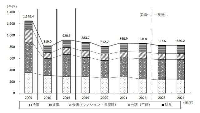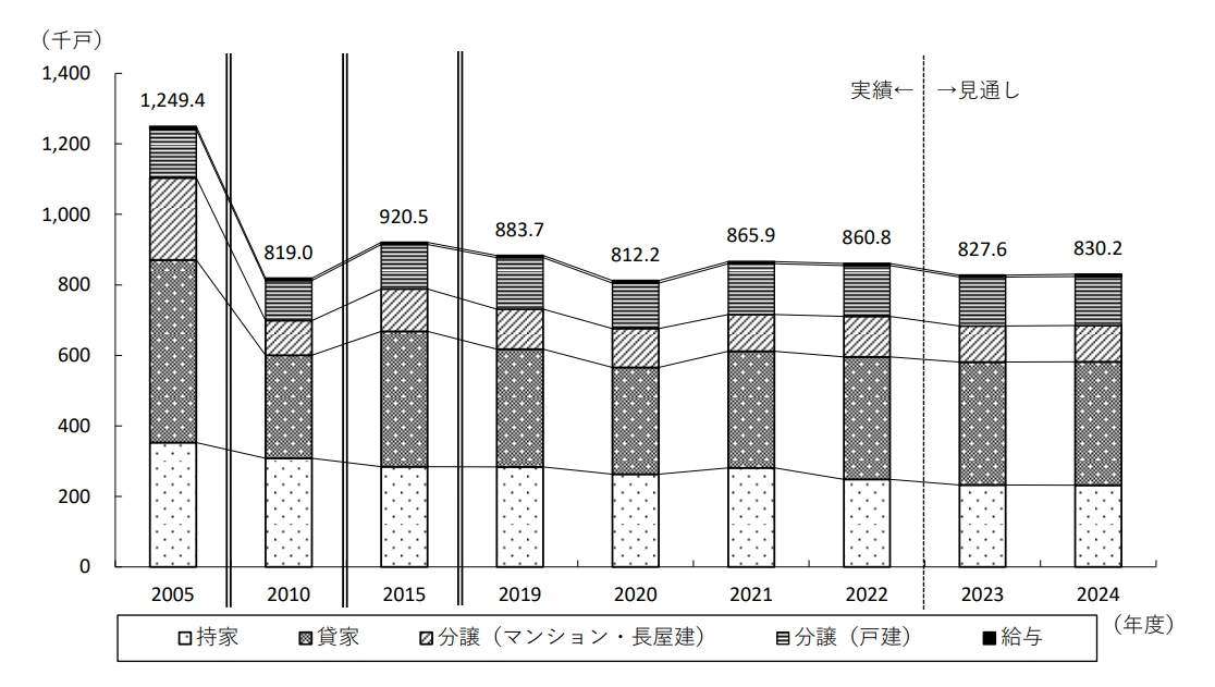 24年度の住宅着工戸数は83.0万戸(同0.3%増)、持家は23.2万戸(同0.3%減)と予測。建設コストの上昇が鈍化しつつも続く見通しだが、拡充される国の支援策が一定の需要下支え要因になるため23年度と同水準で推移すると見ている。民間住宅投資は17兆2100億円を予測する。