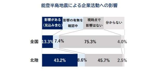 帝国データバンク(東京都港区)は1月19日、能登半島地震の影響と防災に関する企業アンケートの結果を発表した。有効回答企業数は1255社。地震による企業活動について、「影響がある(見込み含む)」とした企業は全国で13.3%、北陸では43.2%にのぼった。