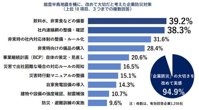 企業防災(企業が行う自然災害への対策)については、94.9%が大切さを改めて実感したと回答。今回の地震を機に、改めて大切だと考えた防災対策を聞いたところ、「飲料水、非常食などの備蓄」(39.2%)が最も多く、4割近くにのぼった。次いで「社内連絡網の整備・確認」(38.3%)、「非常時の社内対応体制の整備・ルール化」(31.6%)、「非常時向けの備品の購入」(28.4%)が続いた。
