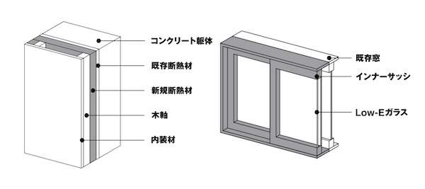 断熱材の厚みを従来品の約1.8倍に増やし、既存窓の内側に複層ガラスの樹脂インナーサッシを採用。立地条件や周辺環境に合わせ、1件ごとに日射取得と遮蔽のシミュレーションを行う。