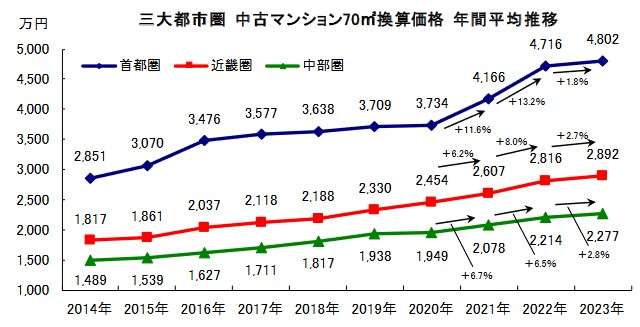 東京カンテイ(東京都品川区)は1月24日、2023年の三大都市圏・主要都市における中古マンション70㎡あたりの価格を発表した。