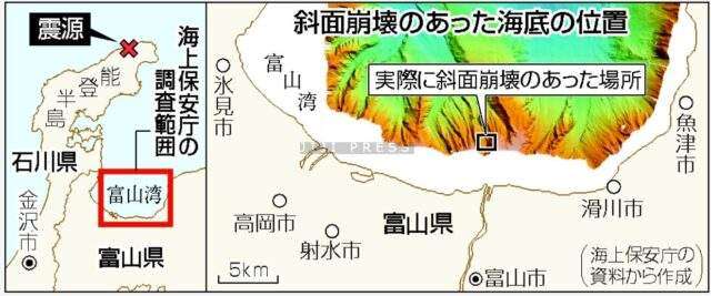 海上保安庁は25日までに、能登半島地震後に富山湾の海底地形を調査した結果、富山市沖約4キロの海底斜面で崩落が確認されたと発表した。同市では地震直後に第1波が観測されており、この斜面崩落によって震源付近とは違う津波が発生していた可能性がある。