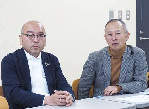 会長の谷田泰さん(右、タニタハウジングウェア代表取締役社長)と事務局長の楠木義正さん(トーコー開発営業部部長)