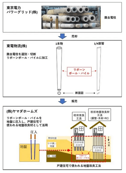 両社はヤマダホームズ(群馬県高崎市)と協業し、リボーンポール・パイルを戸建て住宅用の地盤改良材として適用するための実証実験を実施。従来の住宅用地盤改良工事と比較しても十分な地耐力を保ち、強度面・靭性面で優位性を発揮できるとともに、現状のリサイクル処理過程で二酸化炭素排出を抑制すると実証した。