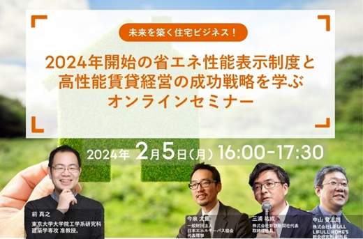 住宅・不動産ポータルサイト「LIFULL HOME’S」を運営するLIFULL(東京都千代田区)は2月5日、「未来を築く住宅ビジネス! 2024年開始の省エネ性能表示制度と高性能賃貸経営の成功戦略を学ぶオンラインセミナー」を開催する。