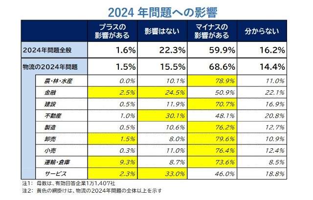 帝国データバンク(東京都港区)は1月26日、全国2万7143社を対象に実施した「2024年問題に対する企業の意識調査」の結果を発表した。有効回答企業数は1万1407社(回答率42.0%)。建設業や運送業などに4月から時間外労働の上限規制が適用されることで、人手不足・輸送能力の低下などが懸念される「2024年問題」について、「マイナスの影響がある」とした企業は59.9%だった。「プラスの影響がある」は1.6%、「影響はない」は22.3%だった。