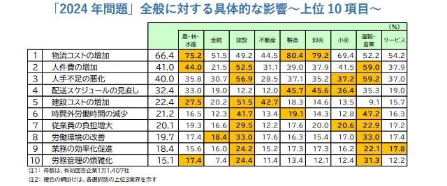 「2024年問題」全般に対する具体的な影響を聞いたところ、「物流コストの増加」(66.4%)が最も高く、次いで「人件費の増加」(41.0%)、「人手不足の悪化」(40.0%)、「配送スケジュールの見直し」(32.4%)が続いた。業界別では、「物流コストの増加」は「製造」で8割超え、「配送スケジュールの見直し」は、「製造」や「卸売」「小売」といった荷主側の業界で平均より高くなっている。「建設」は、「人件費の増加」「人手不足の悪化」など10項目中8項目で平均より高く、特に「建設コストの増加」(51.5%)、「従業員の負担増大」(29.5%)などは9業界の中でトップだった。