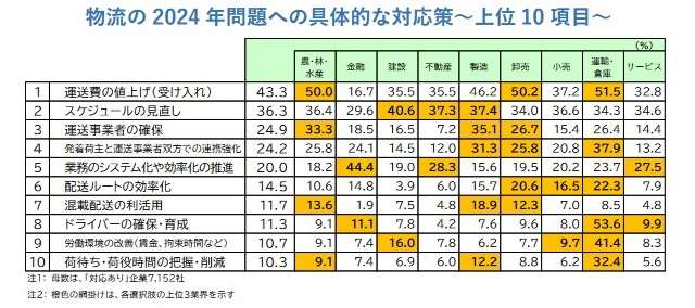 業界別では、「運送費の値上げ(受け入れ)」は「運輸・倉庫」「卸売」「農・林・水産」が5割以上。「スケジュールの見直し」は「建設」(40.6%)や「不動産」(37.3%)などで高く、DXなど「業務のシステム化や効率化の推進」は「金融」(44.4%)、「不動産」(28.3%)、「サービス」(27.5%)で高かった。