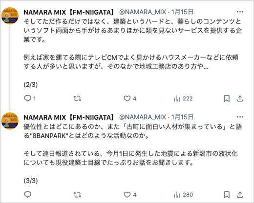 テレビ中継が入るのは限られた地域に過ぎません。多くは被害を残したまま報道もされず、今も訪問調査や補助制度、補修を待ち続けるしかないという現実があります。その場所で暮らす人々が1日でも早く希望を抱き、安心して過ごせるよう、工務店としてできることを考え行動し続けたい。そのために、SNSや関係者とのコミュニケーションで自ら情報を掴みに行く姿勢は非常に重要だと考えます。